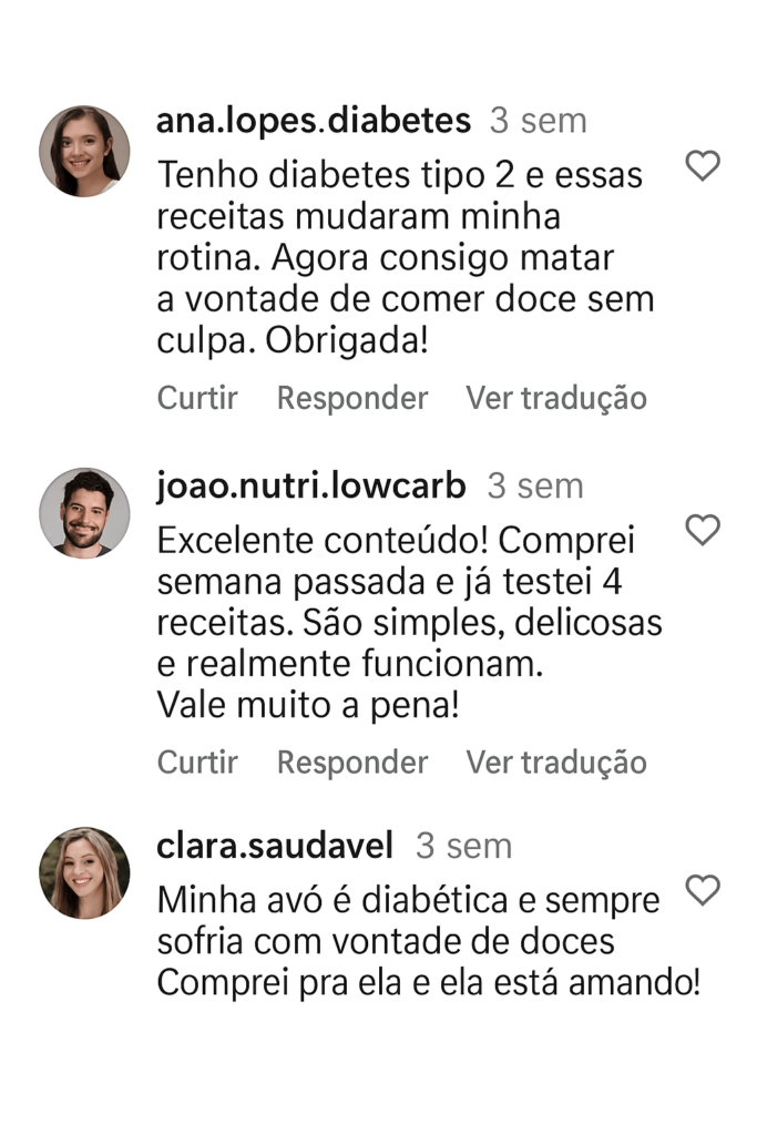 Nele você irá aprender receitas saborosas, práticas e seguras para diabéticos, com ingredientes que ajudam a controlar o açúcar no sangue e melhorar sua qualidade de vida.